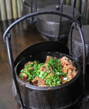 此菜的鐵罐兒既是炊具,也是盛器,那是用生燜的方法把粉蒸排骨烹熟成菜的。