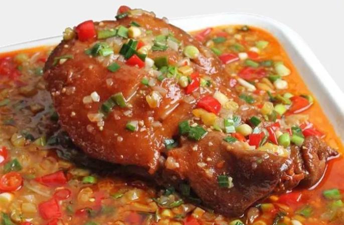 2. 出菜時,把豬頭撈出來裝盤(用刀在肉皮那一面劃數刀,以便成菜後夾食),然後舀入用泡辣椒節、泡豇豆粒、泡大蒜粒、泡野山椒粒和蒜苗顆炒出來的家常泡椒汁,即可上桌。
