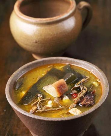 2. 將臘豬蹄塊和幹豇豆節一同放入鐵鍋裡,加適量的海帶塊、清水、薑片和少許的幹辣椒節,燉至肉塊軟熟時(因肉塊帶鹹味,不另加鹽),起鍋裝碗即成。
