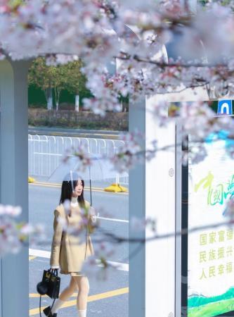臨江大道園林路到三弓路西行公交站,伴隨著櫻花的盛開變身"櫻花車站",美輪美奐,浪漫非常。