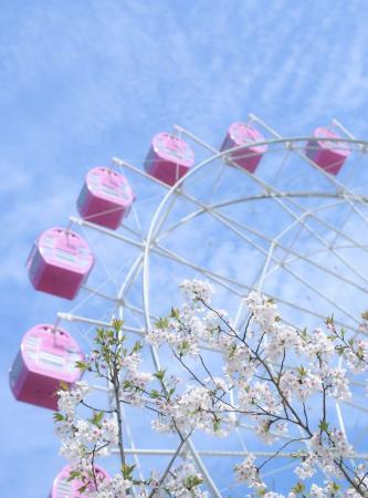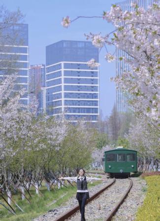 櫻花與粉色摩天輪、綠皮火車的邂逅,爛漫滿分。